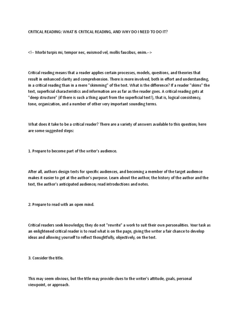 Today, i want to focus on why it's so important to read with a critical eye how to become a critic. Steps to becoming a critical reader it is important to understand the basic structure and content of the text you are reading.
